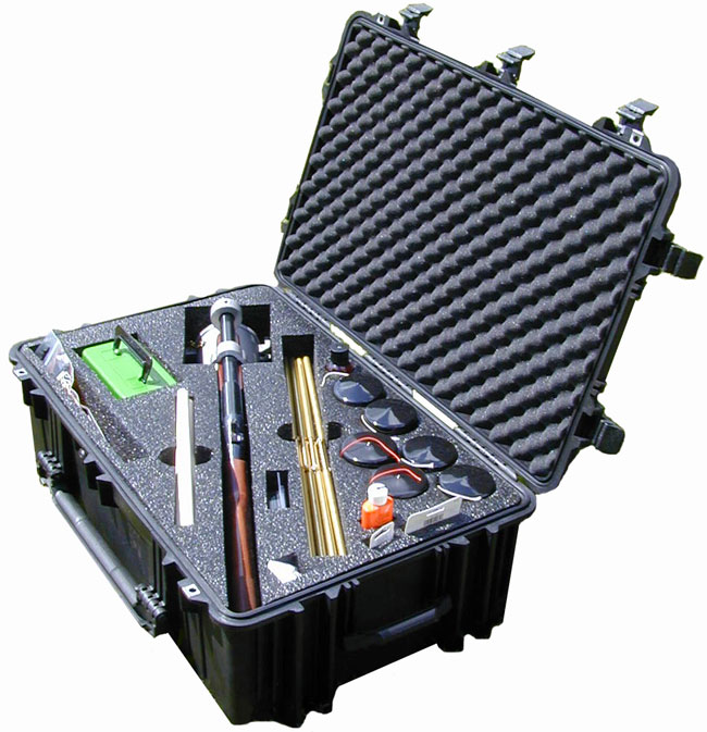 Model #FD85SK (SKB® Case) kit is the same as the CG85 kit, but it comes in an ATA rated SKB® Case with TSA latches and 20 heavy load blank cartridges instead of 25. There is room in this kit for 20 additional blank cartridges and 2 additional lines - if desired. 38" X 13" X 9" Weight 36 lbs.
